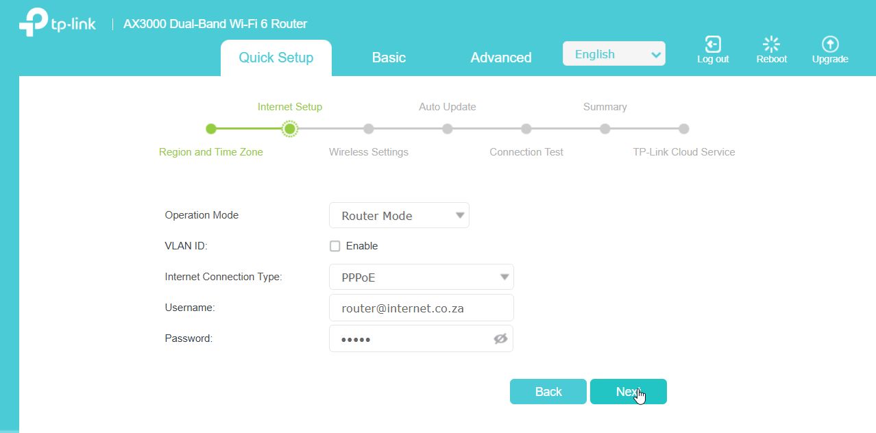 The first step will ask your Time Zone information. You can select the correct Time Zone (South Africa being +02:00), or leave as is for the router to automatically synchronize once setup is completed.