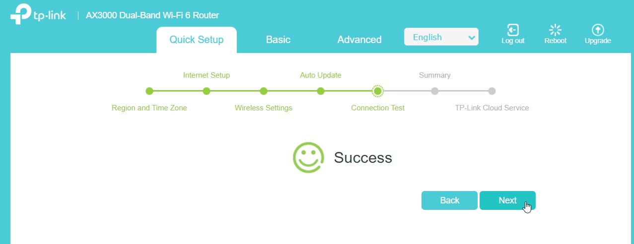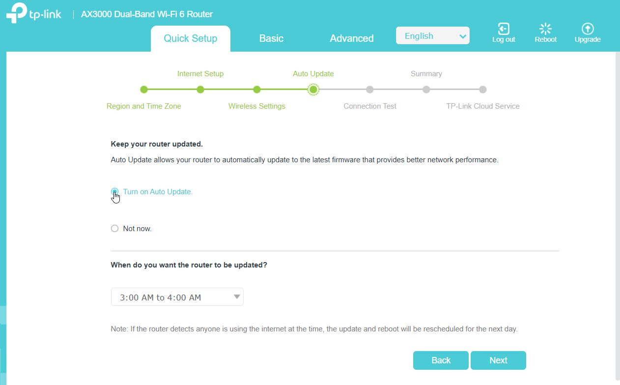 After entering your chosen Wifi details, you will be presented with the router’s automatic update settings. The default update time is outside of normal hours which is the best time for updates to occur.